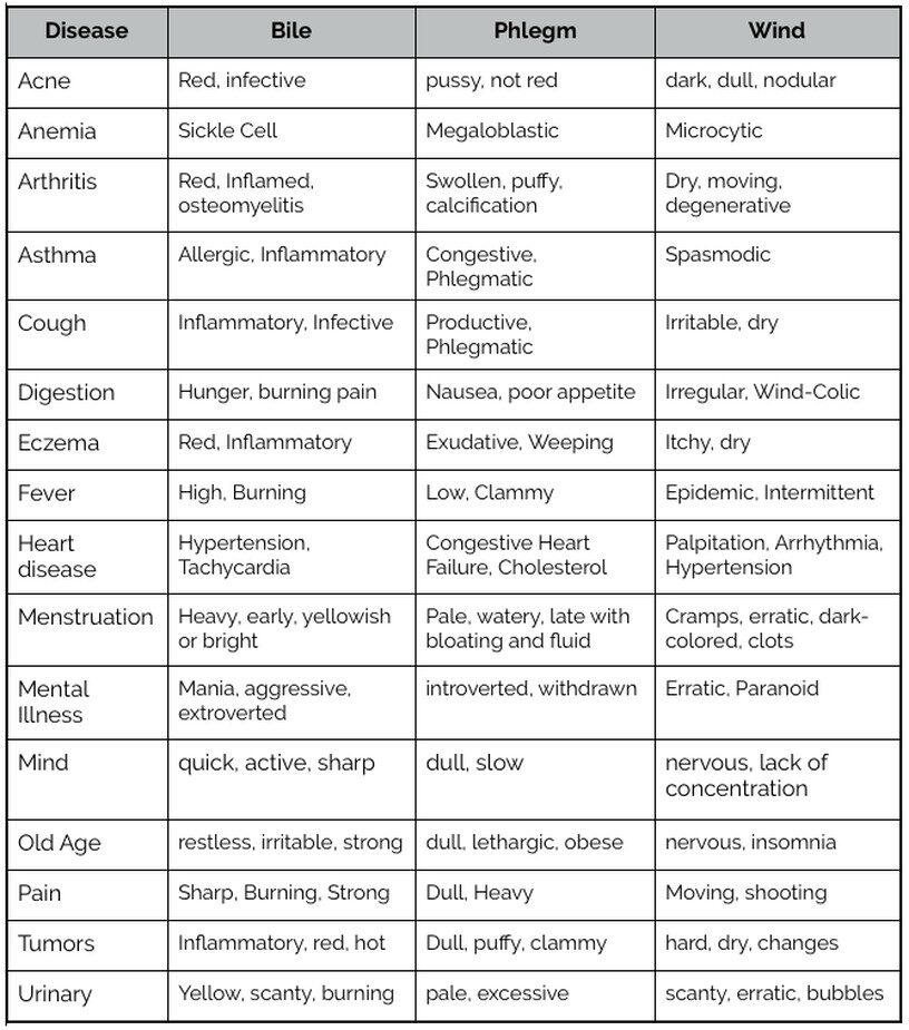 The following list indicates the typical Humoral manifestations of certain diseases. In this case we have focused on Bile, Phlegm and Wind, as only certain diseases are due to Blood. Melancholy diseases tend to be of their own type (Cancer, Leprosy) but have a similar manifestation to Wind, both being Cold and Dry.