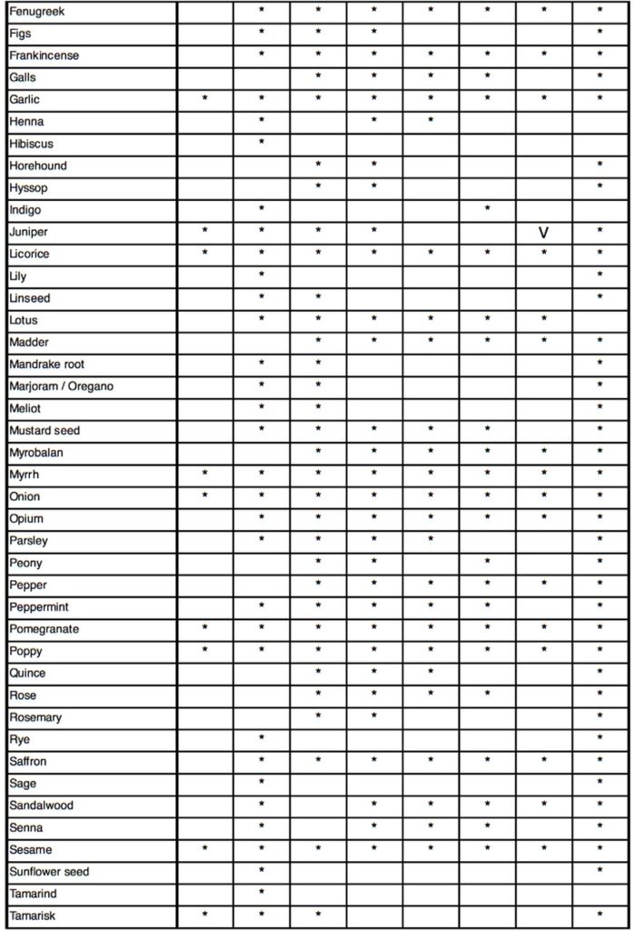 The list may not be fully correct in that it is uncertain if certain medicines, particularly with Sumerian Medicine, were used or not. So that in some case a blank space means ‘uncertain’ rather than ‘not used’.