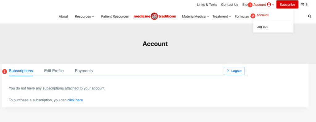 1. Please Note your subscription will automatically renew at the end of the billing cycle. To disable automatic billing enter your email and password in the Member Login, then click My Profile in the bottom left corner. On the dropdown click “Account” page, select Cancel Subscription. Your Subscription will continue until the end of the Subscription period. However, we would love you to continue supporting Medicinetraditions