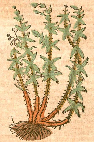 The Sanskrit name for Madder is Manjishtha. Under the names of Fuvvah and Runas, Arabic and Persian writers treat of Madder, probably the produce of R. tinctorium (as the roots which come from Afghanistan appear to be identical with those of the European species). They do not, however, make any distinction between the species, but simply mention a wild and a cultivated variety. The Mahometans consider the drug to be deobstruent and prescribe it in paralytic affections, jaundice, obstructions in the urinary passages and amenorrhoea. They mention the fruit as useful in hepatic obstruction, and a paste made from the roots with honey, as a good application to freckles and other discolorations of the skin. The whole plant is reputed to be alexipharmic; it is also hung up in houses to avert the evil eye, and tied to the necks of animals with the same object. Ainslie observes that the hakims are in the habit of prescribing an infusion of Madder root as a grateful and deobstruent drink in cases of scanty lochial discharge after lying-in. (Materia Indica II., p.182.)
