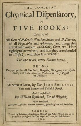 Schroder’s Chymical Dispensatory covers both galenic and chymical preparations, as well as much theory of Chymistry, materia medica and formulas.