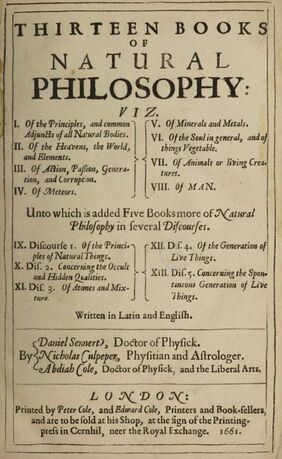 I. Of the principles, and common adjuncts of all natural bodies. II. Of the heavens, the world, and elements. III. Of action, passion, generation, and corruption. IV. Of meteors. V. Of minerals and metals. VI. Of the soul in general, and of things vegetable. VII. Of animals or living creatures. VIII. Of man. Unto which is added five books more of natural philosophy in several discourses. IX. Discourse I. Of the principles of natural things. X. Dis. 2. Concerning the occult and hidden qualities. XI. Dis. 3. Of atomes and mixture. XII. Dis. 4. Of the generation of live things. XIII. Dis. 5. Concerning the spontaneous generation of live things