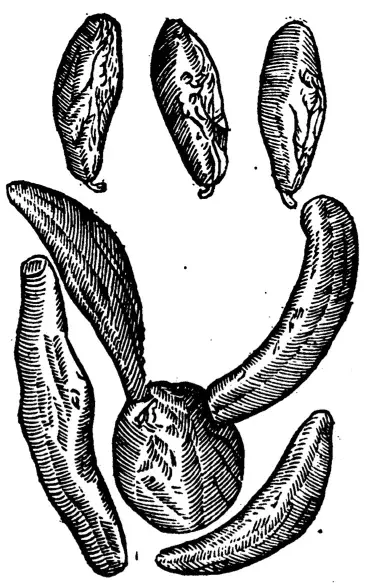 1, Large transverse section of the rhizome. 2. Longitudinal section of the rhizome. 3. Top of the rhizome