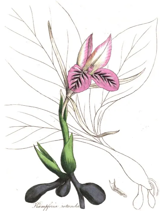 Curcuma zedoaria. C. aromatica is the Round Zedoary (syn. Kaempferia rotunda, Zedoaria rotunda)